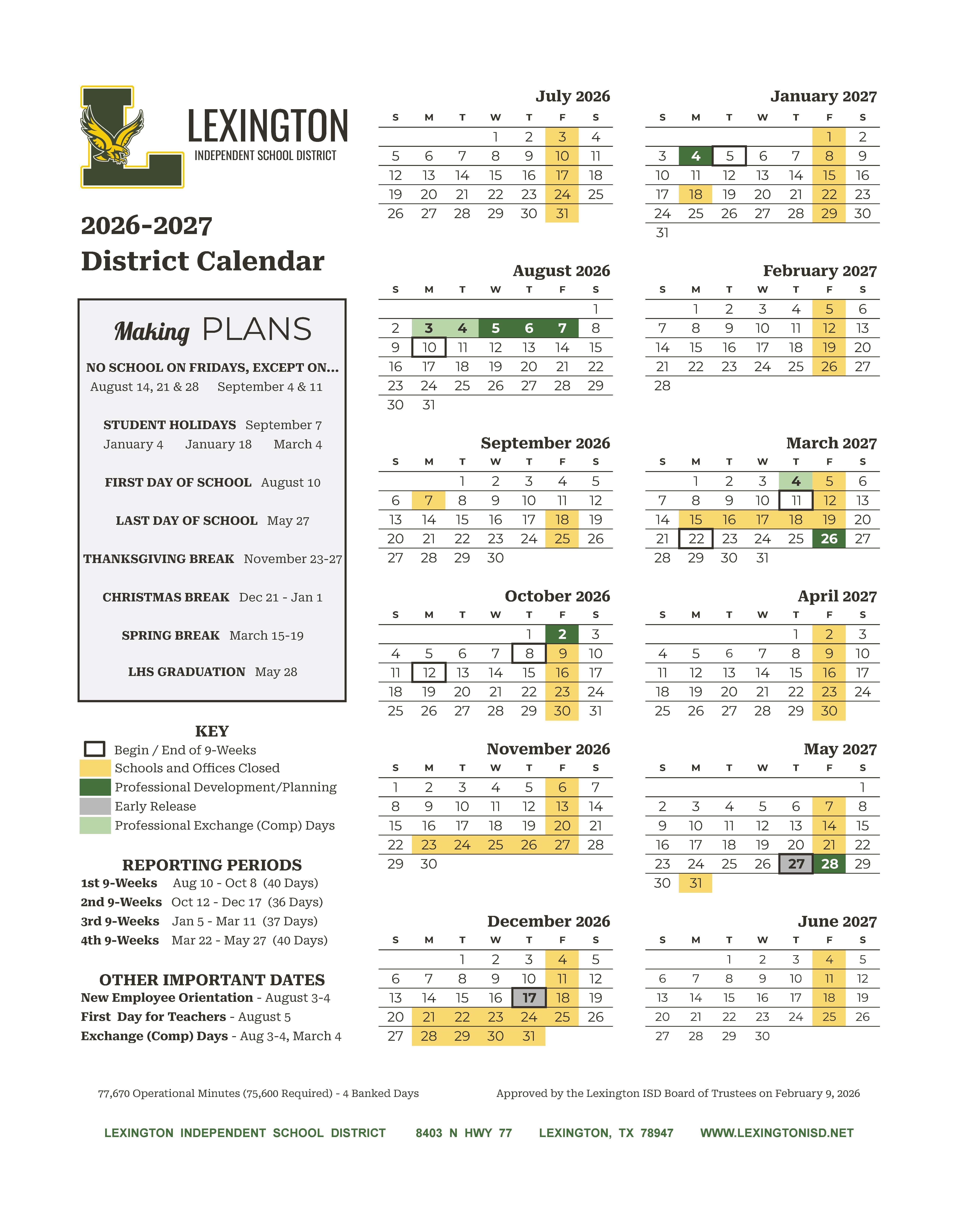 The LISD Board has approved the attached calendar for the 2026-2027 school year. The calendar is almost identical to our current 2025-2026 calendar, but with adjustments in January and August. You will notice there are no school days on Fridays in January. School starts the second week of August rather than the first, and the last day of school is the Thursday before Memorial Day as usual.